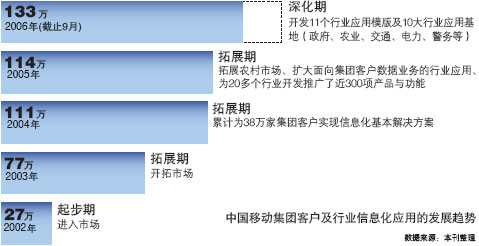 不僅僅是在浙江,從今年年初開始,移動各省公司的集團客戶負責人都忙碌了起來,他們工作進度表上填滿了各種新產品的調研計劃、產品規范和升級改造方案。這是自2005年9月中國移動集團客戶部成立以來的首次重拳出擊,目標非常明確——進軍行業信息化。