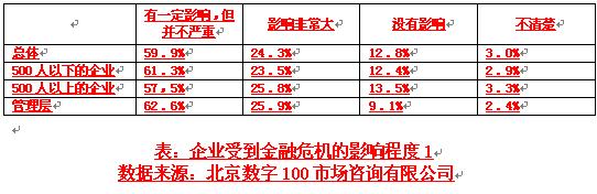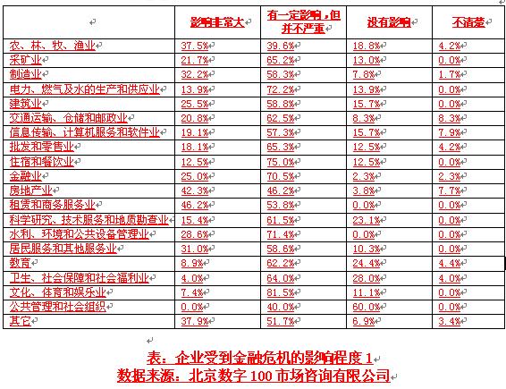 經濟觀察網 記者 嚴鈺 全球經濟疲軟大背景下,中國企業首當其沖受到影響。據北京數字100公司市場咨詢有限公司數據調查顯示,80%人群認為所在企業受到金融危機影響;58.7%人群認為金融危機造成企業銷售業績下滑、利潤減少;另外,調查顯示制造業、金融業、商業服務業、房地產業這四大行業在危機中損傷最大。
