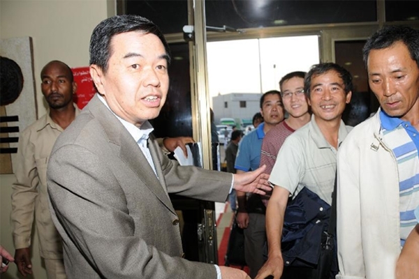 圖為1月30日,在蘇丹喀土穆國際機場,中國駐蘇丹大使羅小光(前左)迎接中水電集團公司的部分員工。(圖/來源網絡)