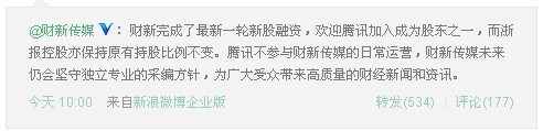 經濟觀察網 記者 閆威 財新傳媒官方微博7月19日確認,財新傳媒完成了最新一輪新股融資,引入騰訊公司成為新股東。財新強調,騰訊不參與財新傳媒的日常運營。