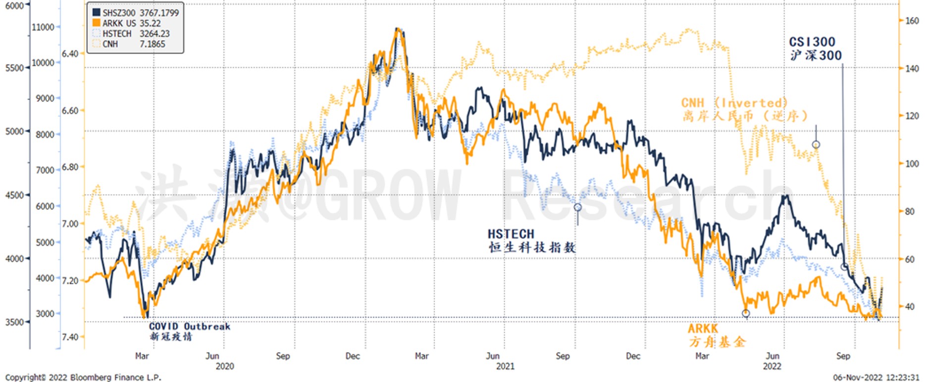 上周史詩級反彈行情的點位水平肇始于2020年2月新冠疫情首次爆發時的市場最低點。疫情以來,美國的財政和貨幣政策輪番上陣,而中國則堅持動態清零方針。到如今,中國市場回到了疫情最初的原點,美股也將亦步亦趨。