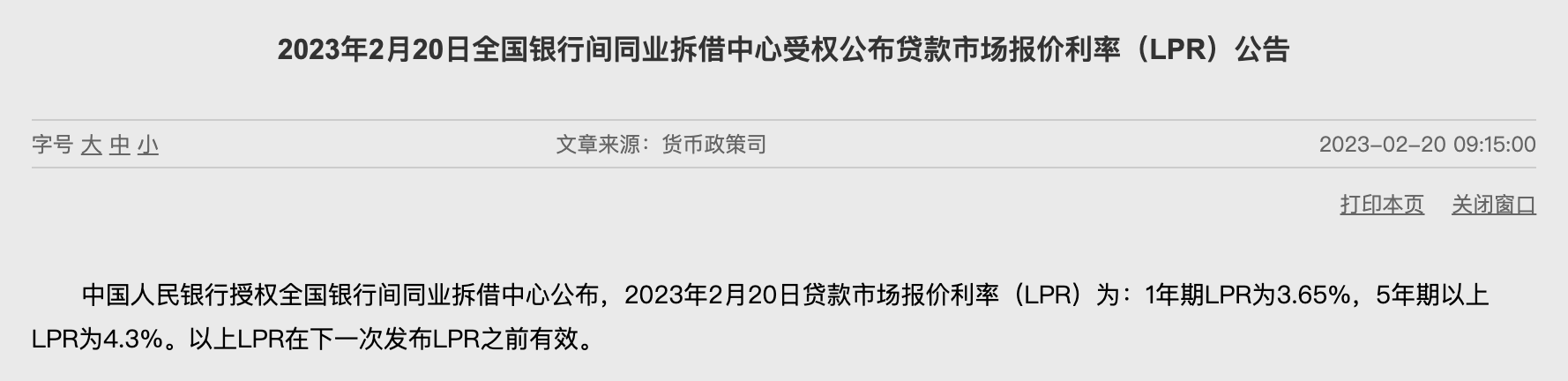 經濟觀察網訊 據央行網站消息,中國人民銀行授權全國銀行間同業拆借中心公布,2023年2月20日貸款市場報價利率(LPR)為:1年期LPR為3.65%,5年期以上LPR為4.3%。以上LPR在下一次發布LPR之前有效。與上月相比均保持不變。