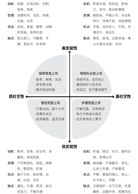 作者在書中指出,人們在工作中溝通和互動的方式主要受兩個關鍵維度的影響。第一個維度是支配性,指的是一個人試圖控制局面或影響他人思想和行為的程度。第二個維度是社交性,它反映了一個人表達情感的意愿以及對人際關系和情感聯結的重視程度。