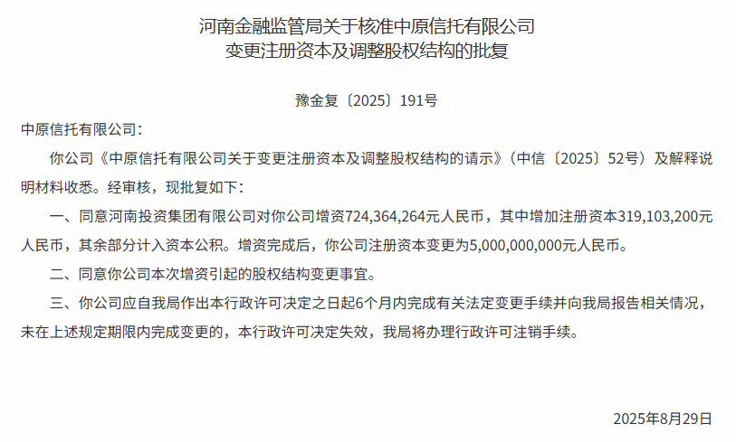 日前,河南金融監管局批復,核準中原信托變更注冊資本及調整股權結構。根據批復,河南金融監管局同意河南投資集團有限公司(以下簡稱:河南投資集團)對中原信托有限公司(以下簡稱:中原信托)增資約7.24億元,其中增加注冊資本約3.19億元,其余部分計入資本公積。增資完成后,中原信托注冊資本變更為50億元。