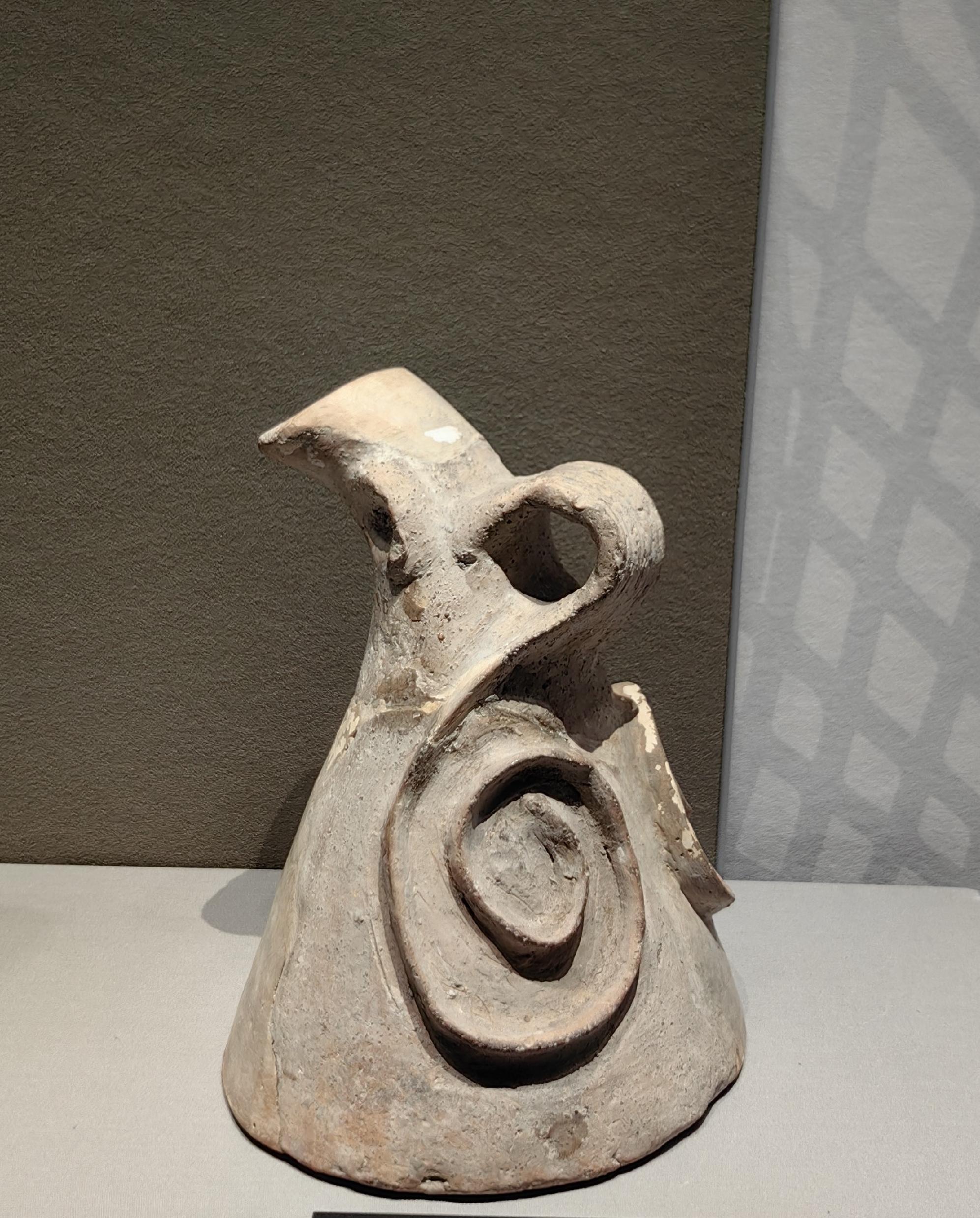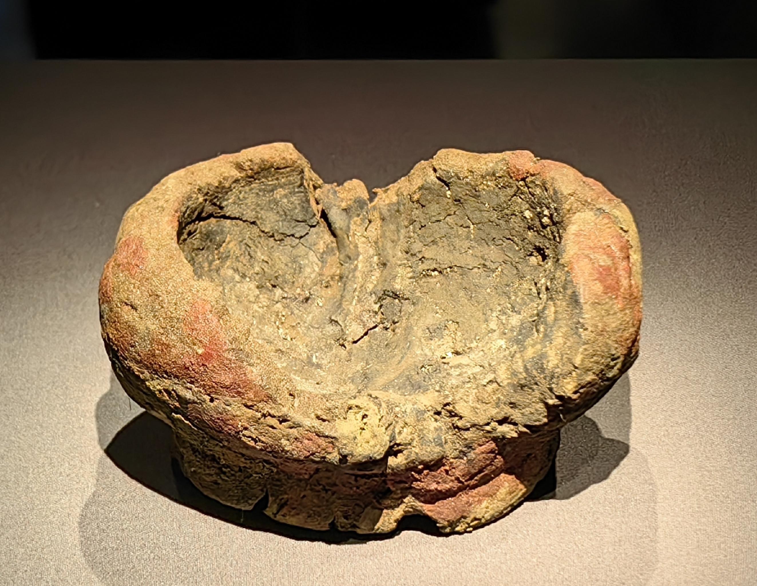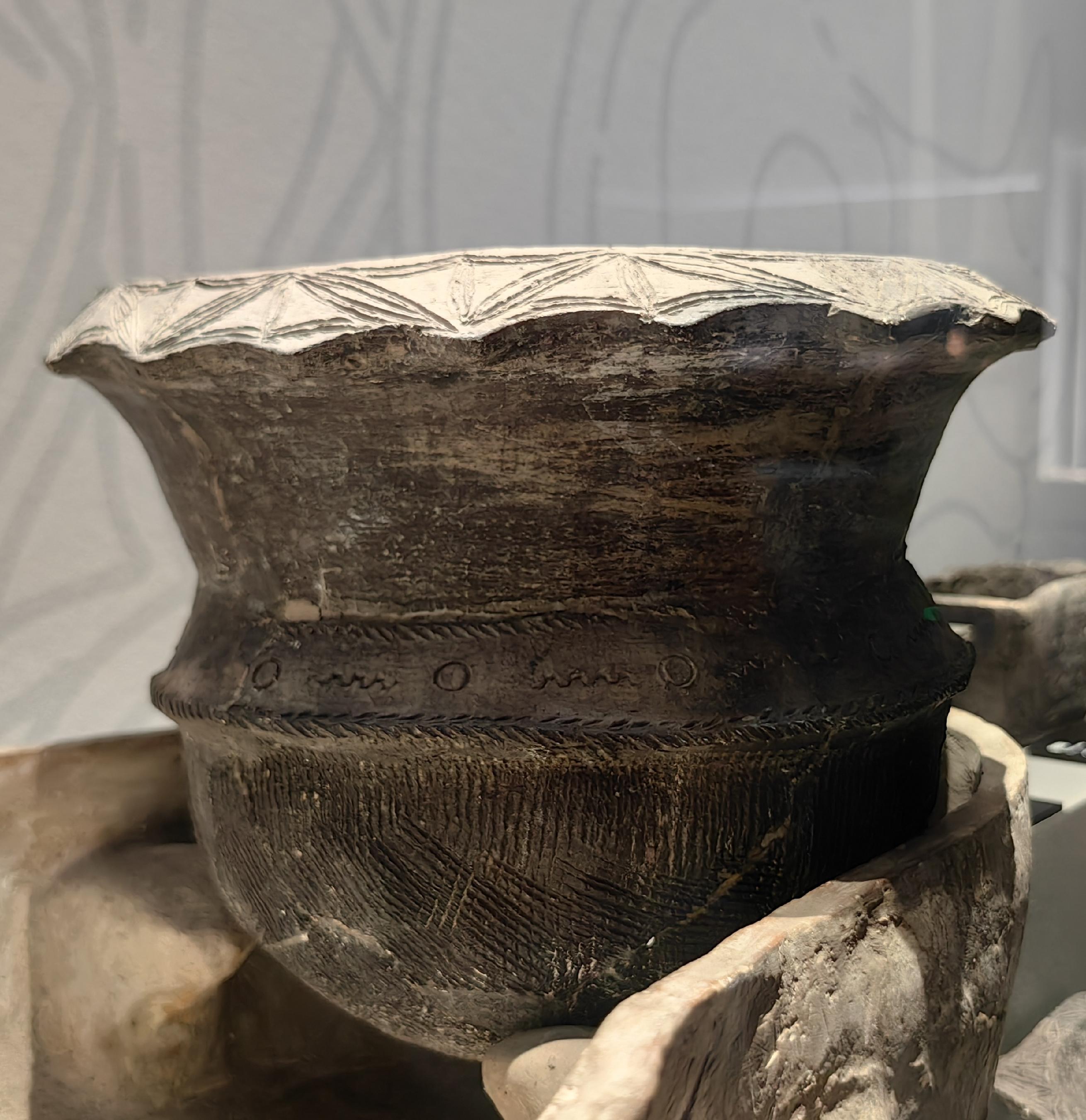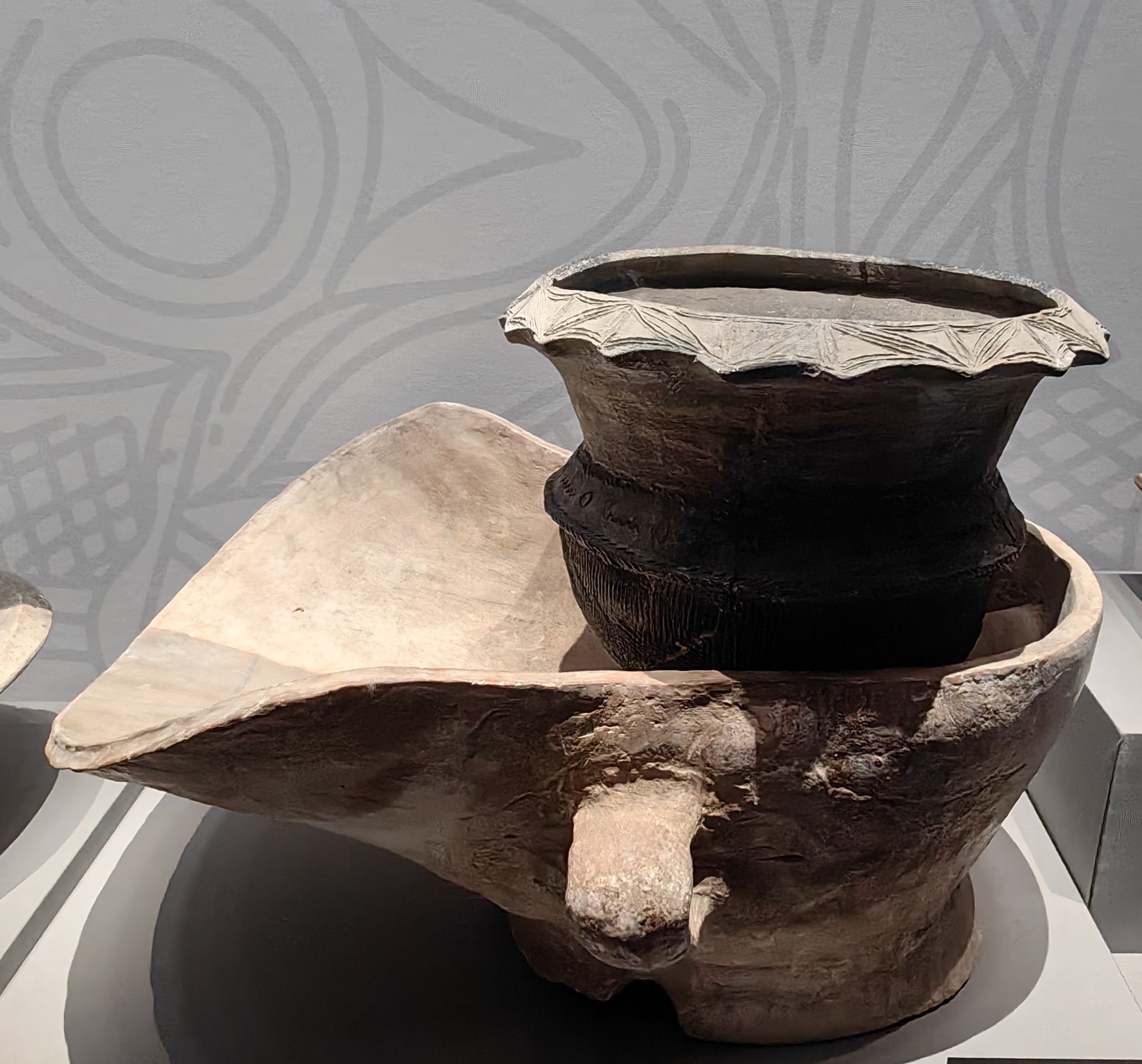 遺址中出土的陶器,器形有各種類型的釜,以及罐、盆、缽、支架等。陶器紋飾由繩紋、弦紋、波浪紋等幾何圖案與豬紋、稻穗紋等具象紋樣交織??虅澰谔张柰獗诘呢i紋表明動物馴養技術已經成熟。