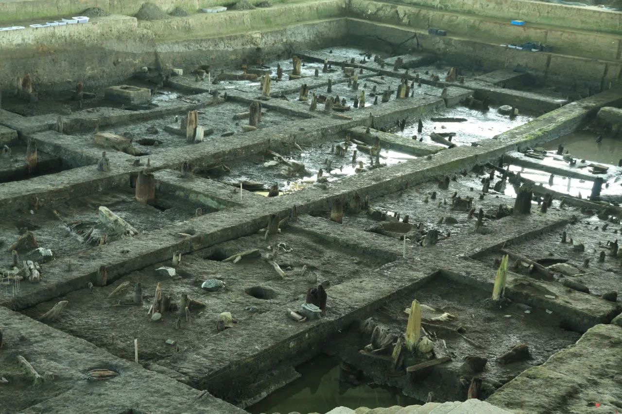 遺址中保存完好的干欄式建筑群,展現了先民卓越的營造智慧。建筑基址以直徑15厘米的木樁為基礎,樁距規整地保持在1.3米間隔。一座長屋遺跡長達23米,進深7米,運用了地板抬升、通風防潮等建筑技術。遺址中發現的水井深1.35米,井壁采用200余根木樁加固,底部鋪設石板作為過濾層,井內出土的汲水陶罐,腹部有特意加重的設計,顯然是為方便取水,深具匠心。