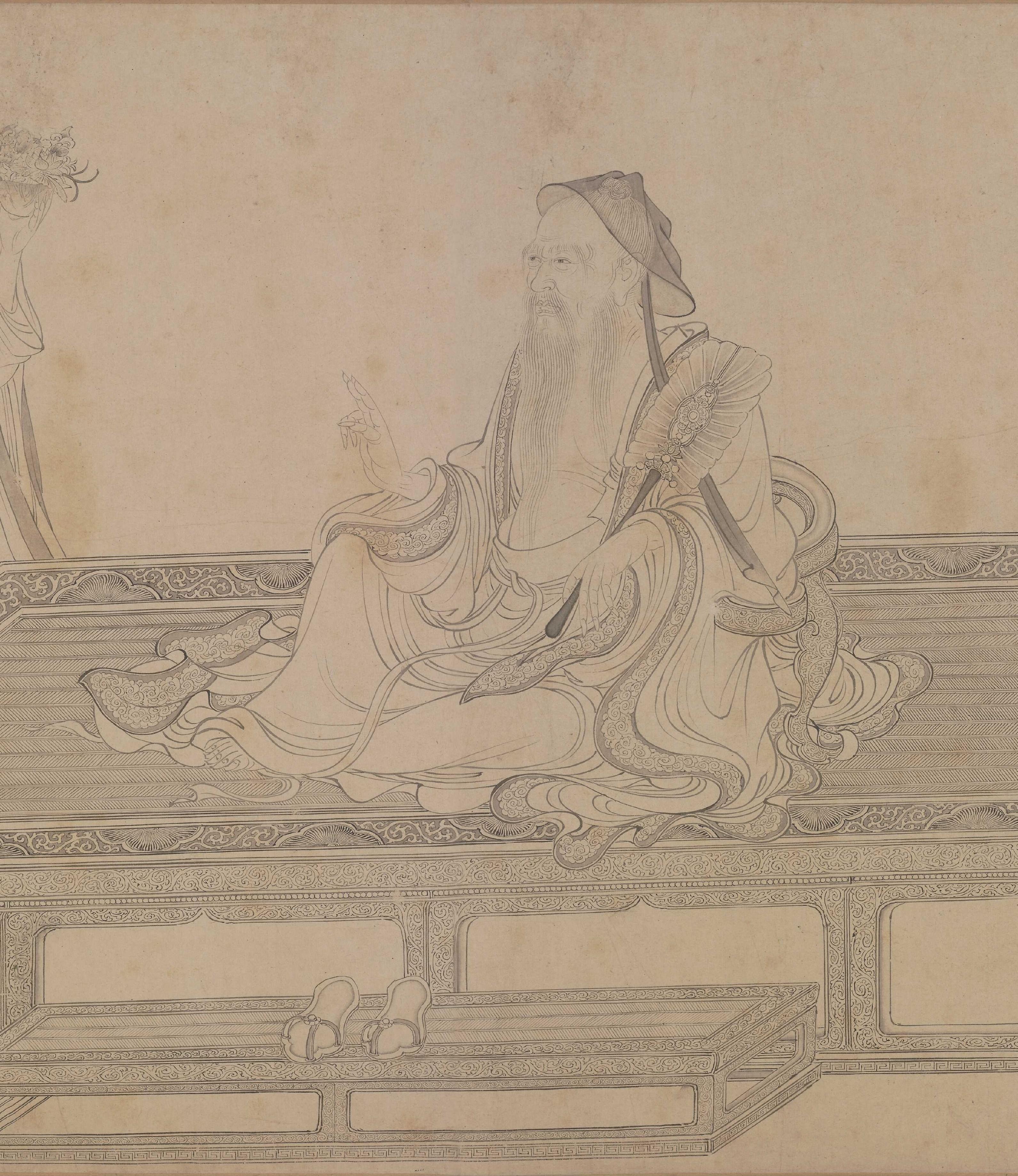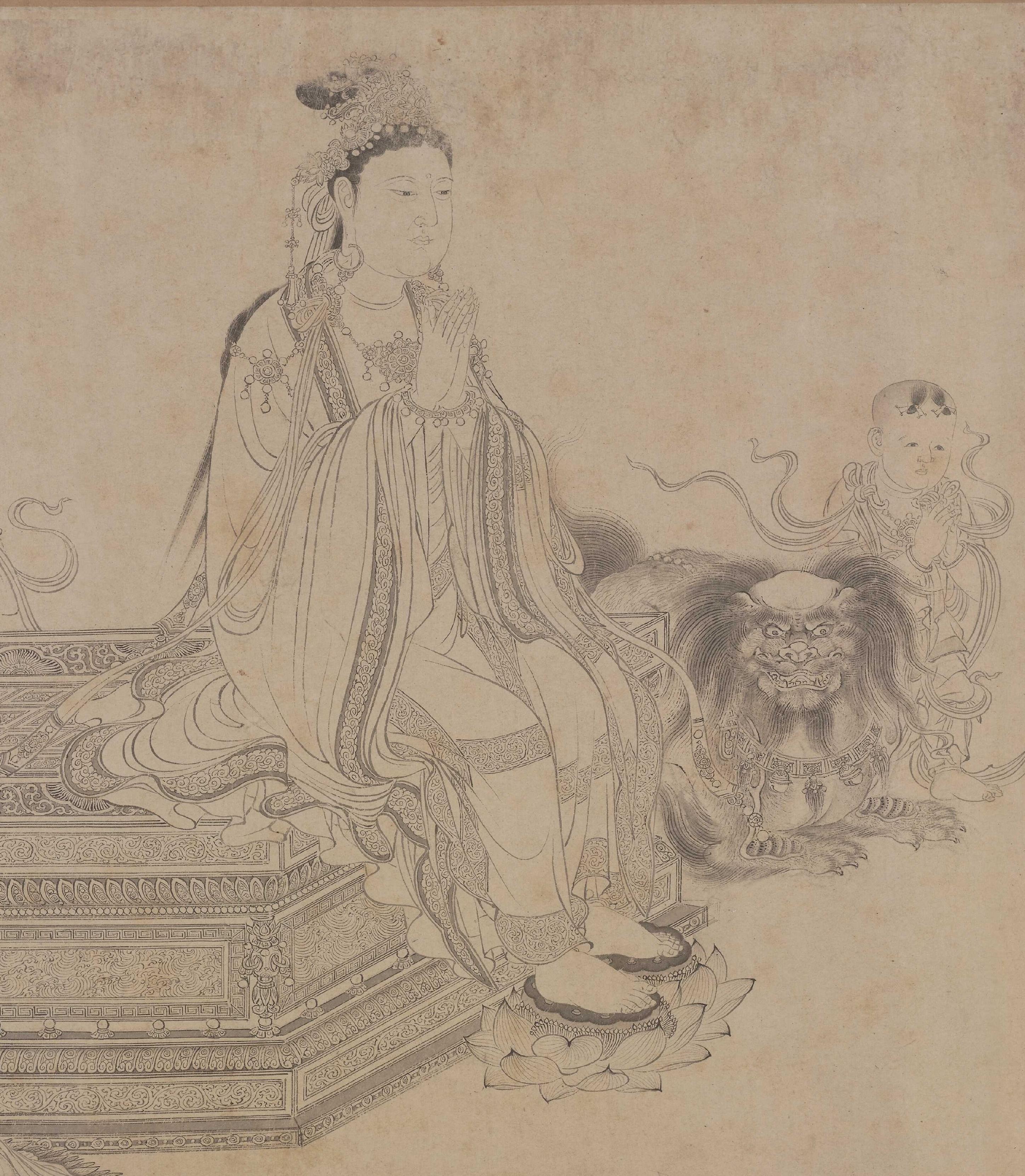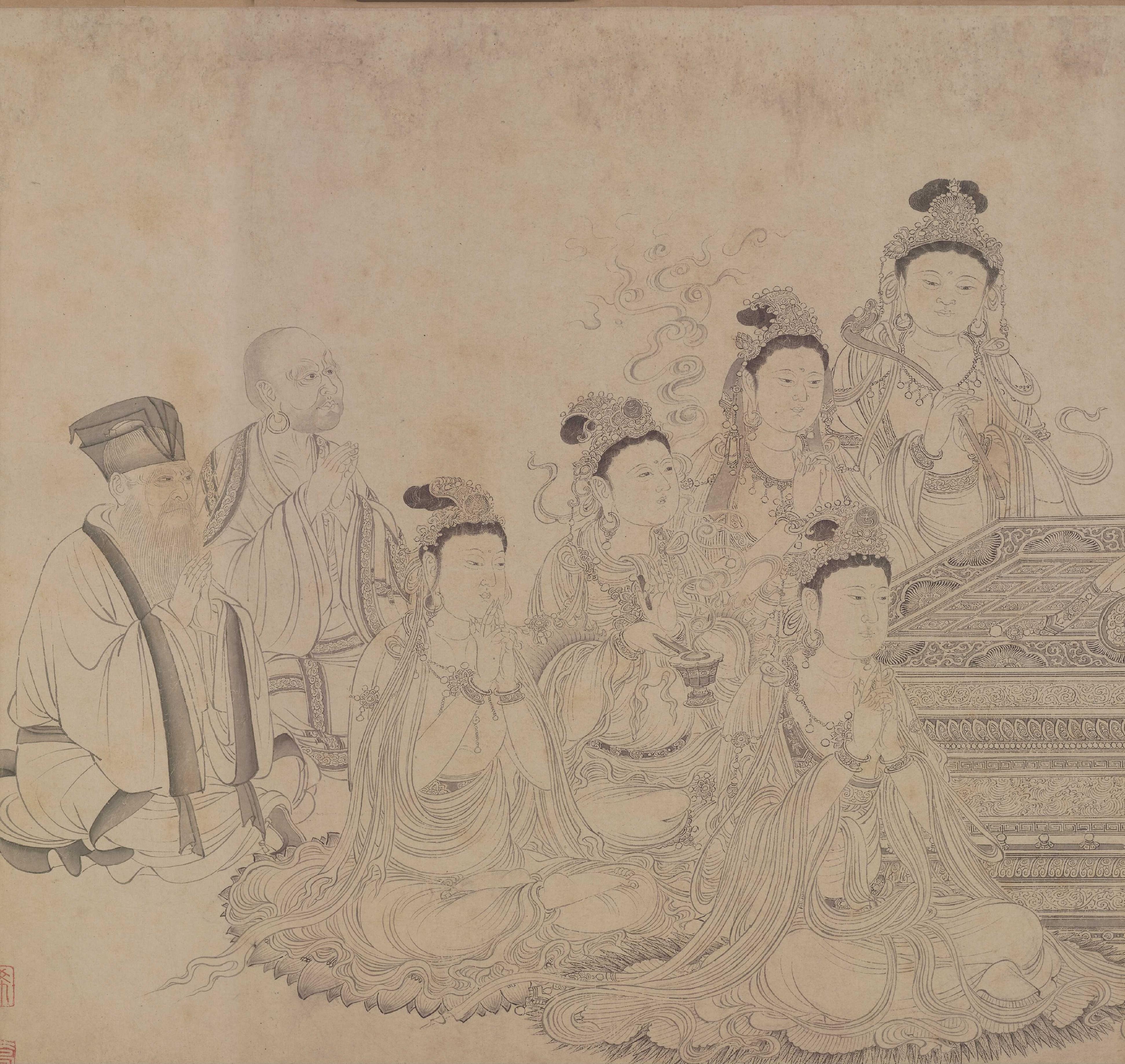 就如《維摩演教圖》,維摩詰的衣紋以凝重而流暢的線條勾勒,在轉折處略加頓挫,表現出布料柔軟下垂的質感。他額頭皺紋緊促,面頰皺紋柔韌,傳達出老者滄桑卻不失神采的氣質。文殊菩薩的衣帶則用輕盈連綿的線條處理,飄逸自然,與面部簡潔圓潤的輪廓形成對比。沒有色彩干擾,觀者的目光全落在線條上,反而更能讀懂事物本身。