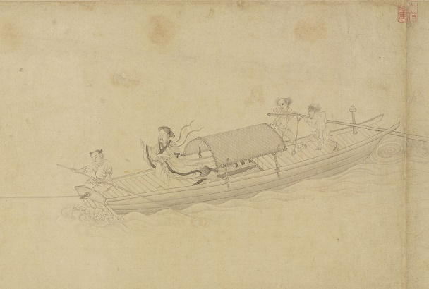 在《歸去來兮圖》中,畫的重點不在田園松菊,而獨取“臨清流處”,以空闊的水面隱喻隱逸心境。還有《孝經圖》中的喪親章,畫中沒有因失去親人而悲痛欲絕的人物,只有一葉孤舟在云山下飄著,水面用虛筆掃過,連波紋都很輕,一如孝子空蕩的內心和孤寂凄涼的愁情。這種以少勝多、以無勝有的含蓄表達,正是文人畫“重意輕形”審美理念的體現。