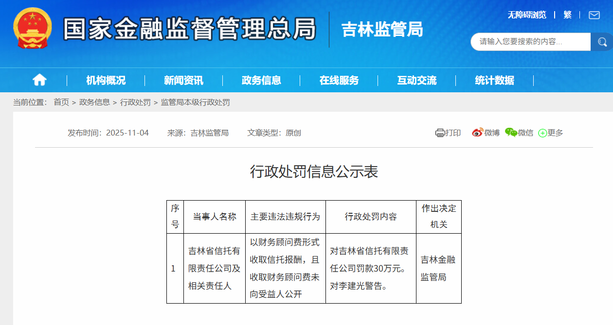 11月4日,國家金融監督管理總局吉林監管局披露的罰單顯示,吉林省信托有限責任公司(下稱:吉林信托)因以財務顧問費形式收取信托報酬,且收取財務顧問費未向受益人公開被罰30萬元。這是該公司年內第二次被公開處罰。