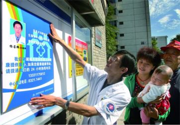 Beijing unveiled a new centralized drug distribution system in December of 2006. Though the reform has been well-received, there have been unforseen bumps in the road of its implementation. Pictured shows a poster informing locals about the Lu Gouqiao community clinic.