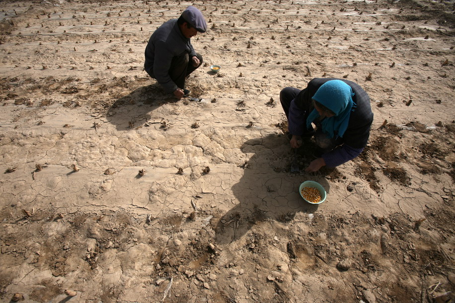After seeding corns into the baked and cracked farmland, farmers can only hope for the best.