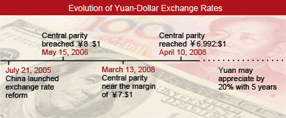 The yuan has moved from 8.11 to one dollar into the 7 range about 10 months after the exchange rate reform was launched; thereafter, the pace of appreciation accelerated, and it began flirting with the 7 line since early this year. Finally on Thursday, the yuan-dollar central parity reached 6.9920.