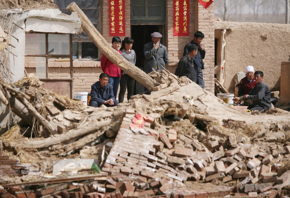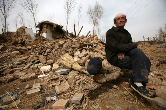 A villager sits in front of his former house, now little more than a pile of bricks.