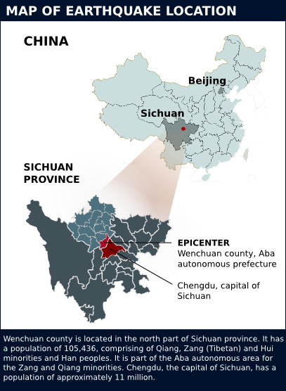 Sichuan province suffered the most from the earthquake on Monday, but nearby provinces also sustained damages from tremors. Casualties and property damages had been reported in Gansu, Shaanxi and Yunan provinces as well as Chongqing municipality.By afternoon on May 13, Chinese government official estimated that the death toll was over 10,000.
