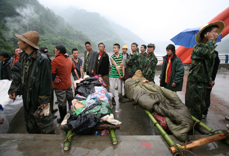 Along Route 213: The injured were being carried out of disaster-hit areas to the main road between Dujiangyan and Wenchuan, waiting to be transported for treatment. [Photo by Luo Jian]