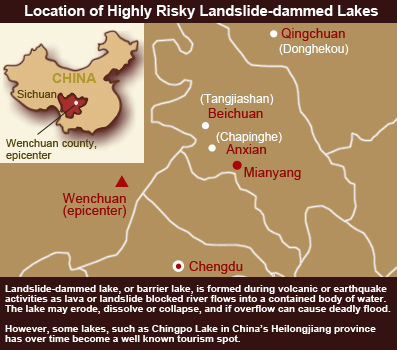 The May 12 earthquake in Sichuan triggered landslide that block river flows and formed over 30 barrier lakes in disaster-hit areas, of which, three lakes in the county of Beichuan, Anxian, and Qingchuan, have been identified as highly risky in bursting.