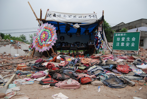 Piles of torn and dusty school bags were laid in front of the makeshift structure, evoking haunting memories of children unable to escape from the collapsed building during the May 12 earthquake in Sichuan. Flowers and candles were placed inside to pay respect to over 120 Fuxin II primary school children killed.