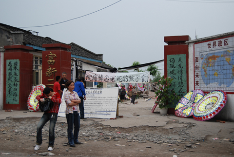 The memorial was set up by mourning parents from Wufu Town, Mianzhu county, one of the worst hit areas where to date, the death toll stood above 10,000, about one-sixth of the total killed in the 8-magnitude quake.