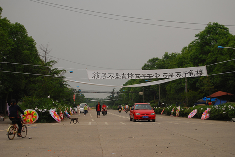 One large banner placed near the altar read: "The kids were not killed by natural disaster; they died from a dangerous building"; another banner stated: "We firmly believe the [Communist] Party and [Chinese] government will act against the injustice done on the children".