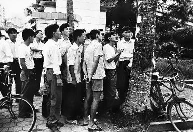 Twenty years ago, the establishment of Hainan province and its special economic zone attracted large numbers of the passionate and ambitious seeking fortunes there. The photo pictures a crowd of youth people searching for jobs on recruitment advertisements on a tree.