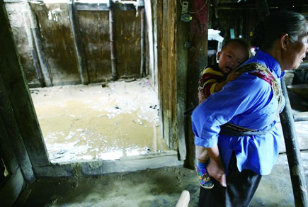 After the floodwater subsided, three Buyi girls of Kuanggou Villiage were washing clothes which had been soaked in mud water for more than one week. Nearby, houses built at lower elevation had also been submerged for more than one week.