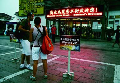 The silk street, one of Beijing's famous commercial streets once loaded with counterfeit apparel brands, has undergone a "cleasing exercise" and now become the shopping paradise for foreign political leaders and tourists during the Olympic Games. Its entrance now displays a billboard calling itself the merchants' Bird's Nest, after the Beijing Olympic national stadium. Taxi drivers also coin the term "Olympic Sideline Stadium" to refer to the market now flooded with foreigners wearing Olympic-related passes.