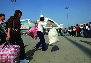 The collapse of numerous small-and-medium enterprises in the Pearl River Delta, themselves victim of a worsening global economic climate, have caused many migrant workers to lose their jobs. Pictured are laid-off migrant workers at local railway station in Dongguan, Guangdong Province lining up to return home.