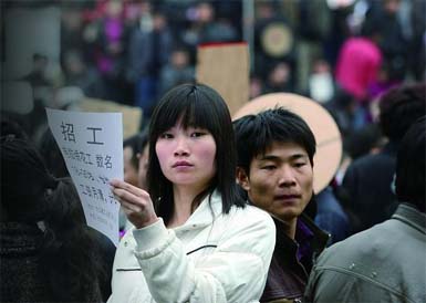 Pictured is a woman holding a job advertisement for female workers in a bustling city in Pearl River Delta. An EO special report looks at the gloomy employment situation in the Pearl River and Changjiang River Delta, China's export manufacturing cradle. Numerous migrant-workers returned to these areas after China's lunar new year to look for a new job. But countless export-oriented firms there have shut down or reduced production after a sharp decline in demands since the US financial crisis set in last Autumn. Millions of fresh 2009 graduates will increase the already enormous pressure in the employment market.