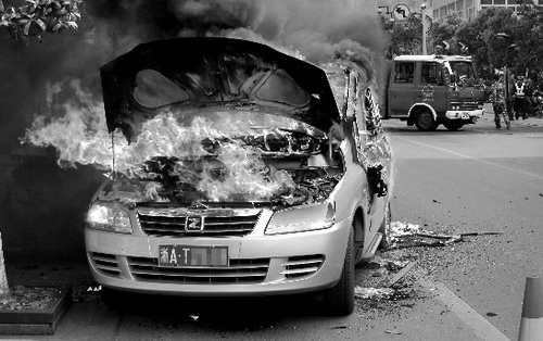 At 2.50pm on Monday afternoon, one of Hangzhou's new electric-powered taxis suddenly erupted in flames.