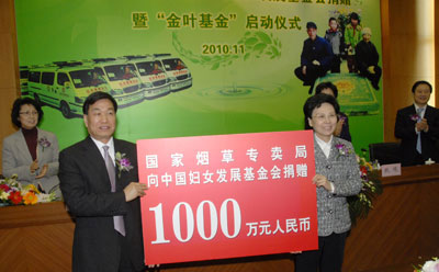 ~China's State Tobacco Monopoly Administration (STMA), also known as the China National Tobacco Corporation (CNTC) donated 10 million yuan toward the establishment of the China Women's Development Foundation (CWDF) Golden Leaf Fund designated for two public service projects: CWDF Health Express for Mothers and Water Cellar for Mothers on November 10.