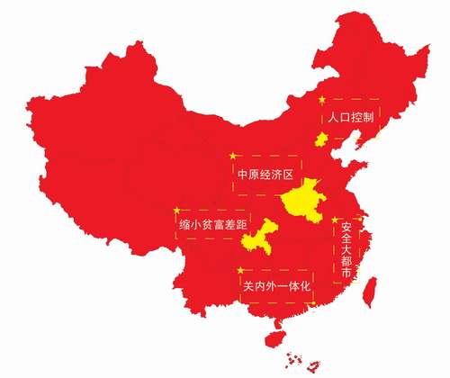 ~ Development in the Central Plains Economic Planning Region will have four aims, the national "three" (industrialization, urbanization, and agricultural modernization), developing a template for economic growth, becoming a center for commercial and industrial transport activity and becoming a historic and cultural center.
