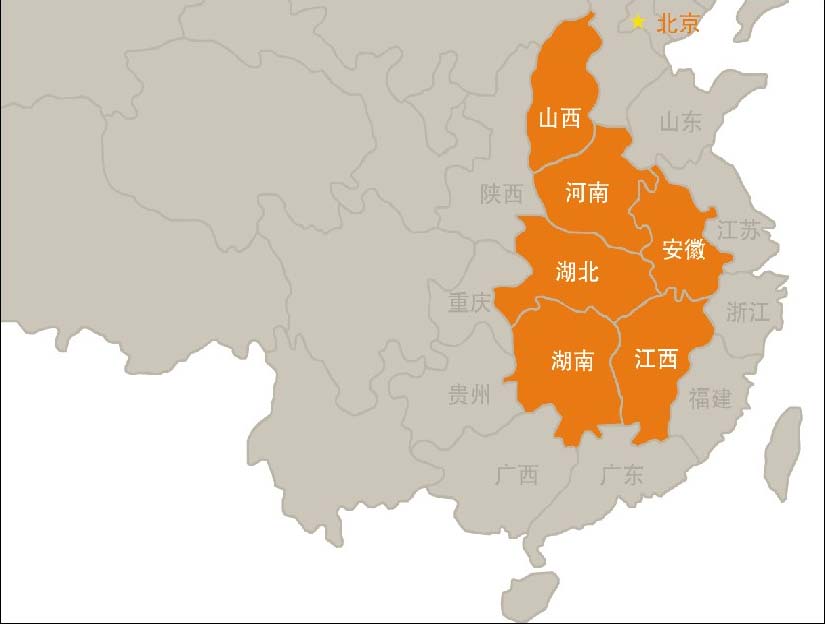 Central China is defined as being made up of six provinces: Shanxi, Anhui, Jiangxi, Henan, Hubei and Hunan.