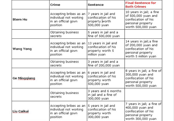 After the sentence was announced, Rio Tinto published a media release on its official website announcing that the company would "terminate the employment" of the four.