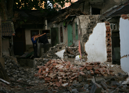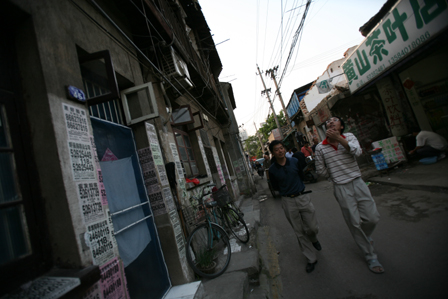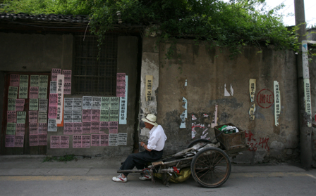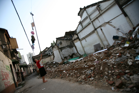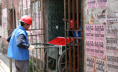 Trash, rubble and bricks cover the street; dust left by the wall-demolishing crews quickly vanishes into the air; small advertisements touting the services of moving companies and home appliance recyclers are plastered over the walls, doors and even the windows along the street.