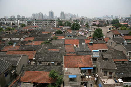 Red banners with slogans such as "The Earlier you Move Out, the More Rewards you Will Get" and "Cast Away Illusion and Make Practical Negotiations" hang from the blue steel fences that have been erected around the residential areas within the southern section of Nanjing's old city. The signs run all the way along Gutong street, which stretches along the length of the southern wall of the old city.