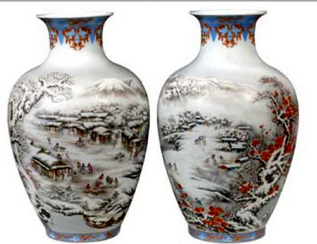 《瓷韻1004》套瓶是凌宗正八十歲的最新力作,并被選定為景德鎮置鎮千年紀念珍藏瓷。一曰《瓷之源》,以蒼松斗雪為主飾,綿延的昌江將景德鎮東埠碼頭、龍珠閣、觀音閣等隱約在遠山近水之間,村舍蕭疏,陶工奔走,貨船如織,形成一幅完整的“匠自八方來,器成天下走”風景長卷,“理”、“趣”、“韻”恰到好處;一曰“韻之脈”,以梅雪爭春為主飾,雄偉的高嶺山下,酡顏童子,辛勤陶工,老梅骨立,新枝勃發,民族之精魂,中華之氣度躍然而出,“神”、“意”、“形”藝趣天然。
