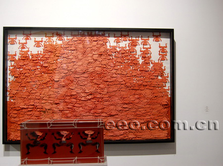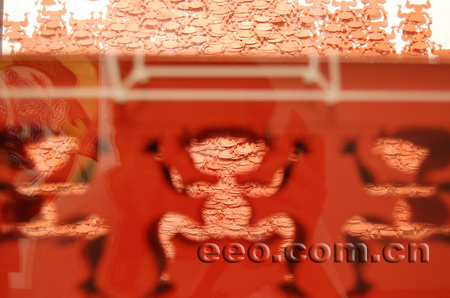 呂勝中作品中的小紅人都是他一刀一刀精心剪紙和排列而成的,有時一個作品中小紅人的數量達到了8萬多,呂勝中也依然堅持自己一個個親手制作。