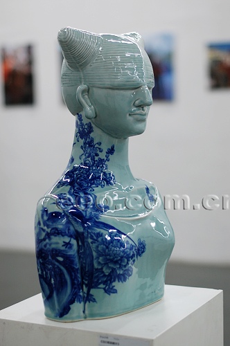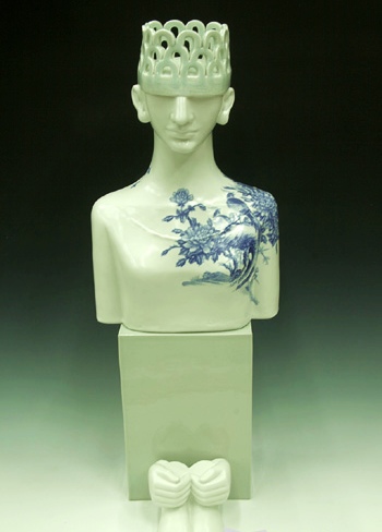 藝術家呂瓊雯是浙江寧海人,2000年畢業于中國美術學院陶藝系,2003年考入中央美術學院雕塑系,攻讀陶藝碩士學位。曾獲中國美術學院崇麗基金獎(2000)、中央美術學院學院之光作品展藝術創新獎(2005)。近幾年,呂瓊雯創作了一系列以耶路撒冷為主題的雕塑。呂瓊雯說:神性化的人像象征著古老的圣城,純凈的白色釉,祥瑞的青花紋飾,力圖傳達一種美好向往。耶路撒冷是民族和平進程之路,也是我翻閱其歷史凈化心靈的心路歷程。我竭力以寧靜的手法表現我的觀感,我們應該走向清明平靜的境界。遮蔽的雙目,抱緊的雙足是現實處境的反映。靜穆與安詳是我所追求的基調,也是心境的自然流露。