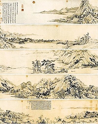 《富春山居圖》,高一尺余,長約二丈。此圖展現了富春江一帶景色:富春江兩岸峰巒坡石,似秋初景色,樹木蒼蒼,疏密有致地生于山間江畔,村落、平坡、亭臺、漁舟、小橋等散落其間。明代大畫家董其昌稱道,“展之得三丈許,應接不暇?!钡拇_給人咫尺千里之感。