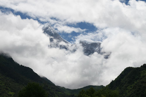 老蘇在雅江邊溜達了一陣,近距離拍了一些雅江和直白大拐彎的照片。正往回一路上坡地走,猛一抬頭,發現遠處南迦巴瓦的云層正在迅速地游動。老蘇不自覺得停下了腳步,靜靜地望著遠處的天空。也就幾分鐘的時間,天空中就出現了一個雪白的尖尖的山峰直插云霄。