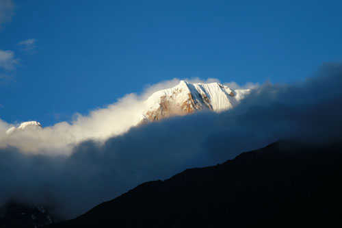 老蘇抬頭向遠處看了看,哇噻,一個雪山頂在夕陽的照耀下金光閃閃地露出云端。那會不會就是海拔7234米的佳拉白壘峰呢?