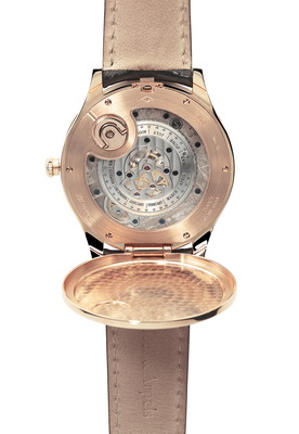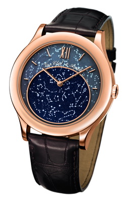 前文所言梵克雅寶注重從自然界汲取設計養分,那么全新款男式腕表Midnight in Paris即為最好例證。設計師的巧思,將玫瑰金或白k金制成的圓形表殼塑造出簡約線條,而表盤的手繪金點砂金玻璃轉盤更重塑出夜幕下的巴黎星宿圖。轉盤可隨著一年365天的周期微微轉動,無論佩戴者身在何地都可每天為您捎來一小片巴黎星空。表底的功夫也頗見功底,腕表底部像袋表一樣設有揭蓋細加保護。打開表蓋后,便可隨時查看由真正隕石包圍的精美日歷。佩戴者更可透過表盤選擇檢視特定日子的星空,例如佩戴者的生日或結婚紀念日等重要日子。