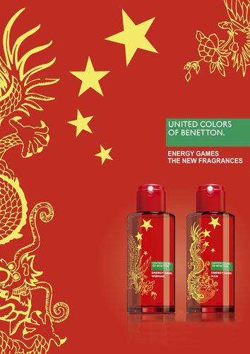 貝納通(Benetton),其實它不應該列入奢侈大牌的行列,但是貝納通進入中國市場時間之久恐怕是很多大牌無法毗及的。這次推出的充滿中國奧運元素的喜動活力香水也頗有特色?!∑孔拥牟Aе螤?,以華麗的紅色作為背景,飾以兩種強烈的中國文化象征圖案:鳳凰和龍。鳳凰,古代傳說中的百鳥之王,代表喜動活力女士香水。龍,一種神圣的吉祥物,長久以來令男性為它著迷,代表喜動活力男士香水。