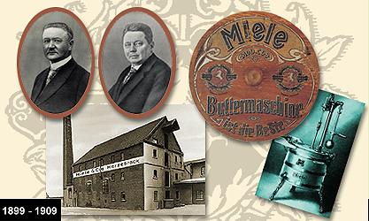 1899年.在德國中西部北萊茵-威斯特法倫地區的海爾策布羅克小鎮的一座舊磨房里,Miele品牌創始人Carl Miele和Reinhard Zinkann成立了Miele & Cie公司.在公司成立之初,他們主要生產奶油分隔器與牛油攪拌器,目的是為了幫助農民減輕工作負擔. 過了一年,1900年Miele的兩位創始人Carl Miele和Reinhard Zinkann開始將攪拌器的工作原理(配置攪拌棒的槳式橡木桶)運用到他們的第一臺洗衣機上,將不起眼的牛油攪拌器設計為木桶洗衣機.這也成為了全世界第一臺洗衣機,盡管這還只是一臺操作比較笨拙的木桶洗衣機,但是在過去100年中,卻為家庭主婦命運帶來了決定性的改變. 一九二九年,第一臺洗碗機再次從Miele手中問世,往后的五十年間,這家公司陸續推出的烘衣機、烘碗機,烤箱,咖啡機,吸塵器等,都成為了引領全球家電市場的先鋒者。