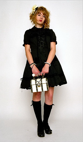 在時尚界,設計師們對Lolita風格進行了延伸.他們混合了哥特式與洛麗塔這兩種風貌并將其稱為“哥洛式”的風格.“哥洛式”是天使與惡魔的結合體,主色為黑和白,就是想表達一種神秘好奇的感覺,當然芥末黃、墨綠、絳紫都有這樣的效果,比前幾種類型多了份女人的細膩和浪漫的詩意;蕾絲的加入,柔和了黑白兩色凸現的極端感,這正是優雅哥特式洛麗塔所追求的。