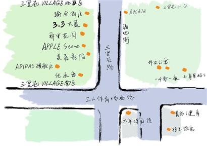 有過一陣子的蕭條,被后海搶了風景——有水有橋,喝酒的地方是“看得見風景的房間”;也有年輕人流失到南鑼鼓巷和其他胡同里洋氣的小酒吧去了。這樣的情形到三里屯VILLAGE、那里花園和3.3大廈這三棟挨著的建筑全都露面后,就發生了變化。