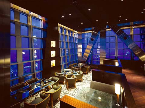 酒吧的裝修充分利用了大廈內部獨特的空間,立柱、斜撐鋼梁和拋光鍍鉻鏡面弧形連接,有種太空味。