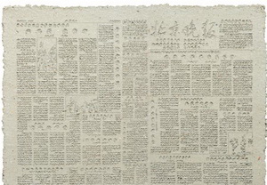 藝術家張震宇運用特殊方法將報紙或書籍轉變為紙漿,然后將紙漿重塑于畫布。通過重塑剝離先前各種表征使之呈現出最初的單一物質屬性。報紙仍是報紙,但被消除了時效性,書籍成了只剩實體和形狀的無言書。藝術家持續一年的時間,每天細致地刮擦掉人民日報首頁的文字和圖像信息。
