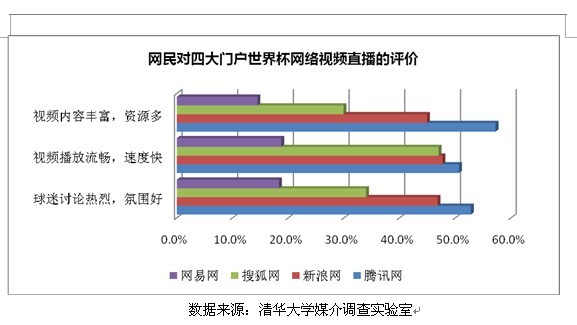 小組賽期間,賽事視頻直播最受網民關注,數據顯示,52%網民使用騰訊網收看世界杯網絡視頻直播,超出其他門戶網站。在“視頻內容豐富,資源多”,“視頻播放流暢,速度快”,“球迷討論熱烈,氛圍好”三項指標上,騰訊網都以絕對優勢領先其他門戶網站。