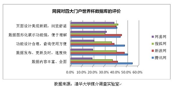 騰訊網世界杯賽事數據庫也贏得了網民的認同,46%網民表示,小組賽期間通過騰訊網來查詢世界杯賽事數據。在四大門戶數據庫使用調查中,在數據內容豐富、全面,數據發布、更新及時、速度快,功能設計合理、查詢使用方便等幾項核心指標上,騰訊網均名列第一,得到網民認可。